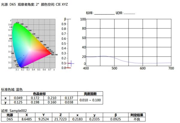 譬如如何判定藍色試樣是否在《GB/T18833-2012道路交通反光膜樣》所規定的藍色區域內(無金屬鍍層,晝間反光膜顏色),按照下面的步驟,將依次完成測量和判定。