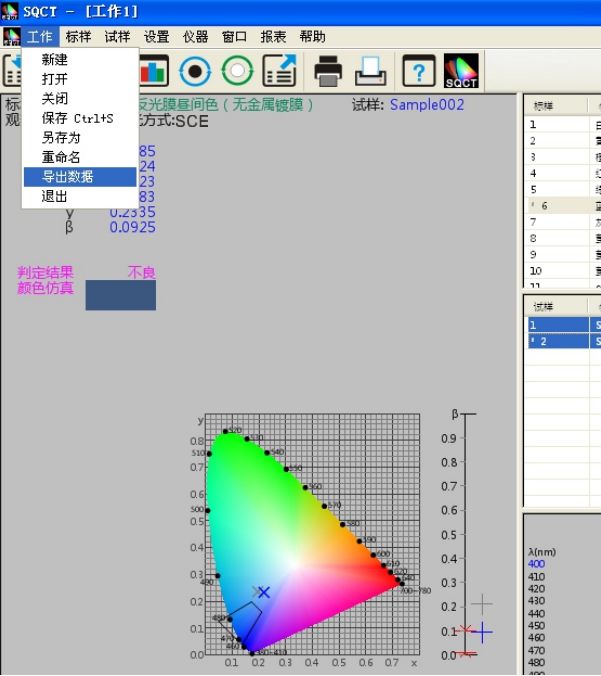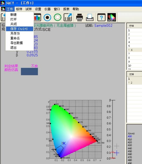 SQCT直接將《GB/T18833-2012道路交通反光膜樣》的多邊形顏色區域做入軟件中,可以直接從菜單中選擇,“標樣->道路交通反光膜GB/T18833->晝間色(無金屬鍍膜)”如圖11所示。