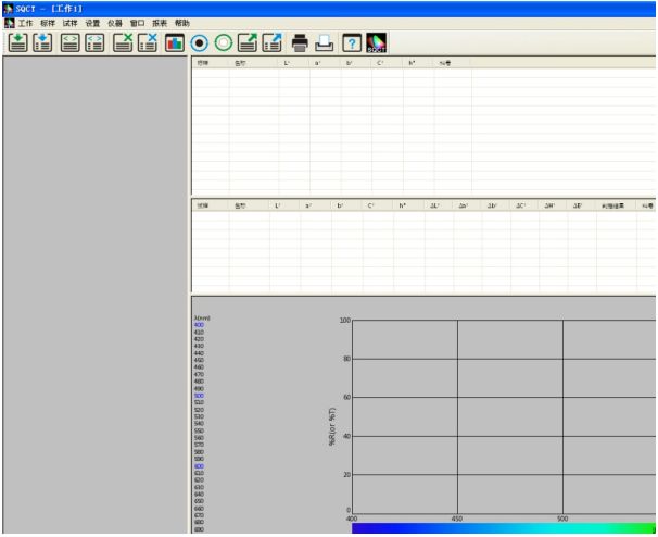 NS808的交通路標測試模塊主要是通過上位機軟件SQCT配合NS808儀器實現的。使用前需先安裝好SQCT上位機軟件,再連接NS808儀器,然后打開上位機軟件,默認為普通測試界面,如圖1所示,在該界面下可以完成CIEL*a*b、XYZ、ΔE*ab、ΔE*cmc、ΔE*00等色度數據的測試,詳細菜單和工具欄的介紹請參照該軟件自帶“色彩管理控制軟件使用說明書”,這里重點介紹交通路標測試模塊。