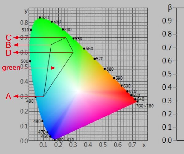 通常給出一塊顏色區域(多個色品坐標點)和亮度因數要求,在D65/A光源和45/0幾何條件下,判定樣品是否落在對應的顏色區域內,借此判定樣品是否滿足標準規定的色度要求。