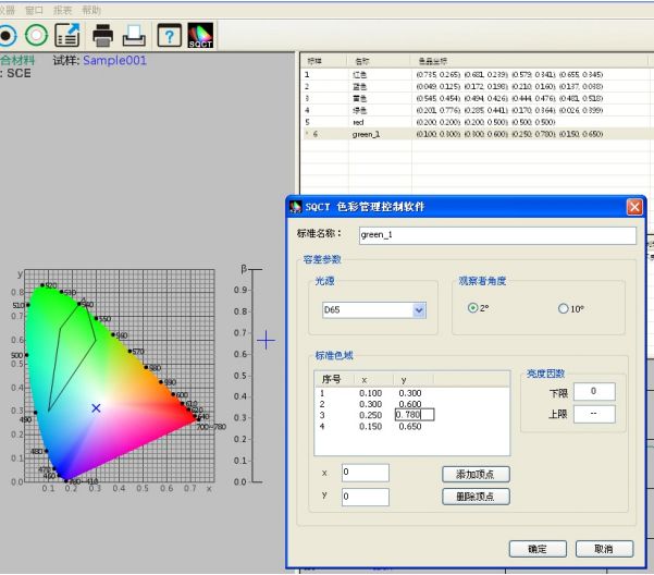 如圖7所示,修改上面建立的名稱為“green”的多邊形-容差標樣,先選中該標準,然后可以修改“標準名稱”“光源”“標準觀察者角度”“亮度因數”“色品坐標”,修改完畢,點擊“確定”按鈕,則修改生效。