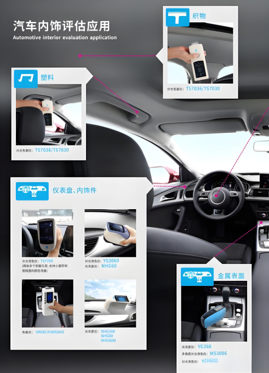 為了滿足消費者對汽車漆面外飾件和內飾色彩的高要求,三恩時引入了先進的色彩管理工具—MS3005多角度色差儀,為汽車涂漆與內飾色彩測試提供精準解決方案。